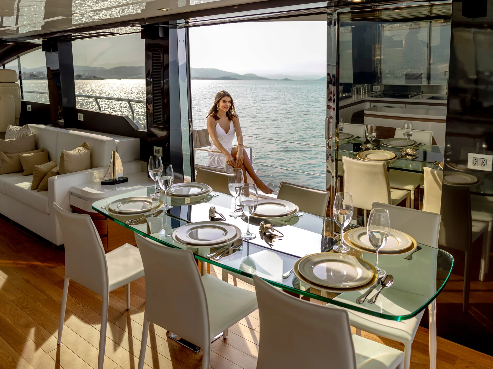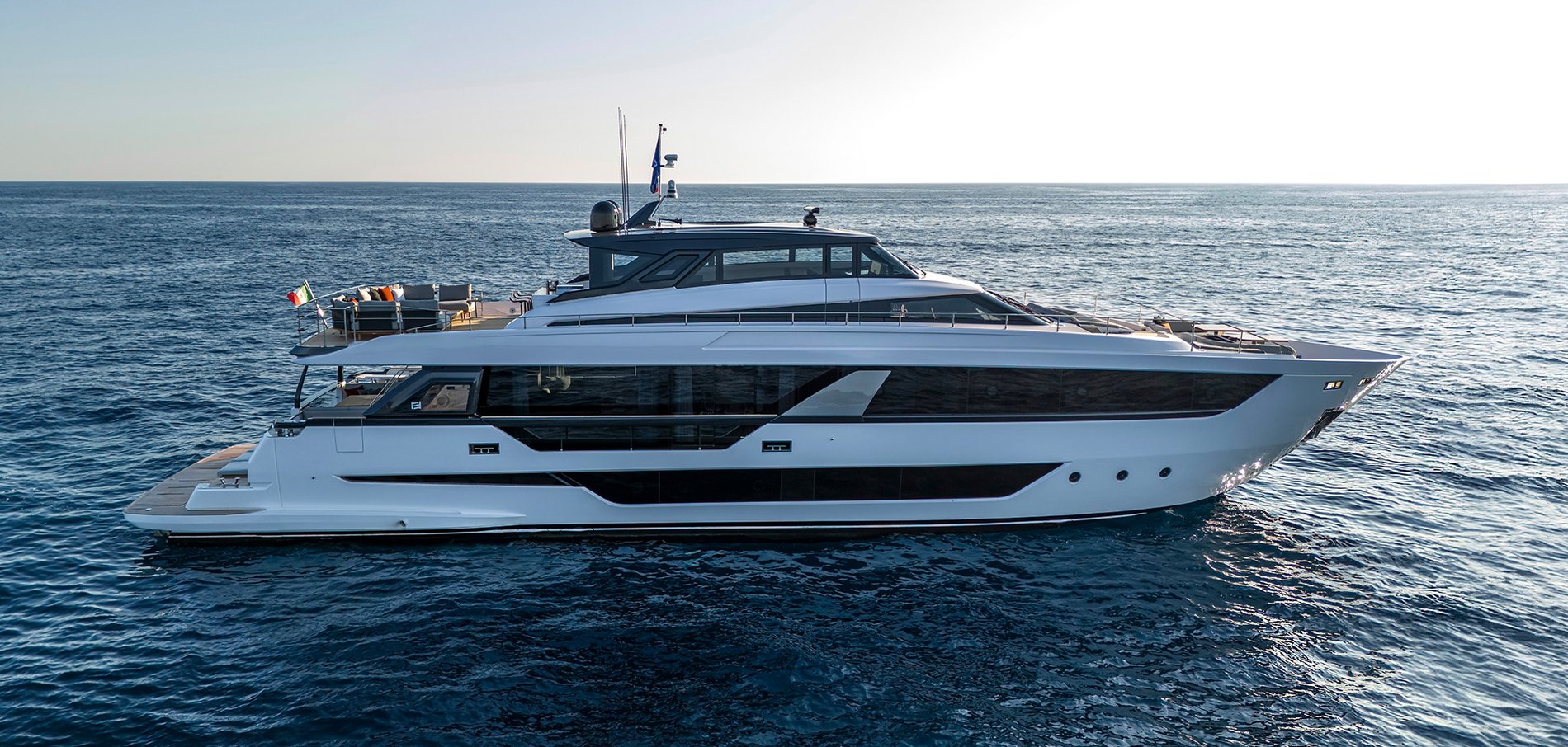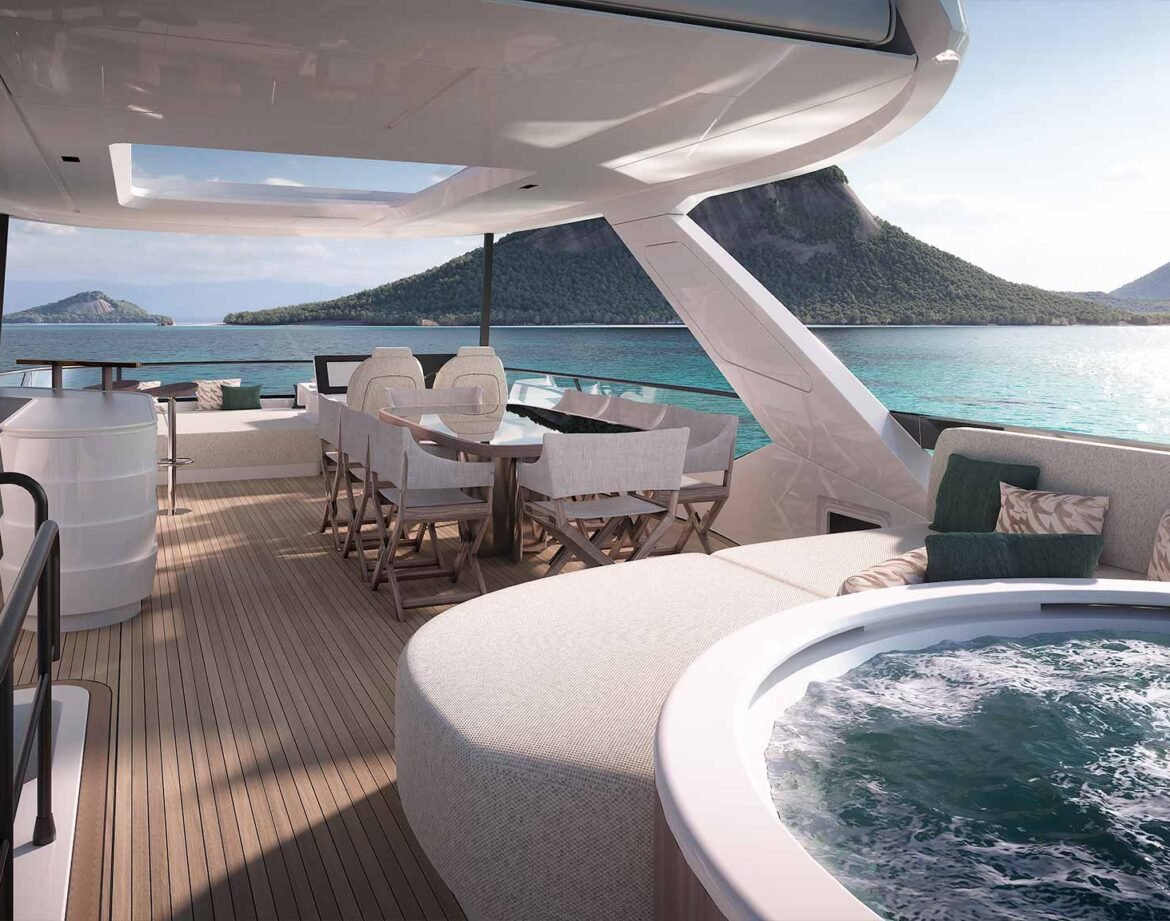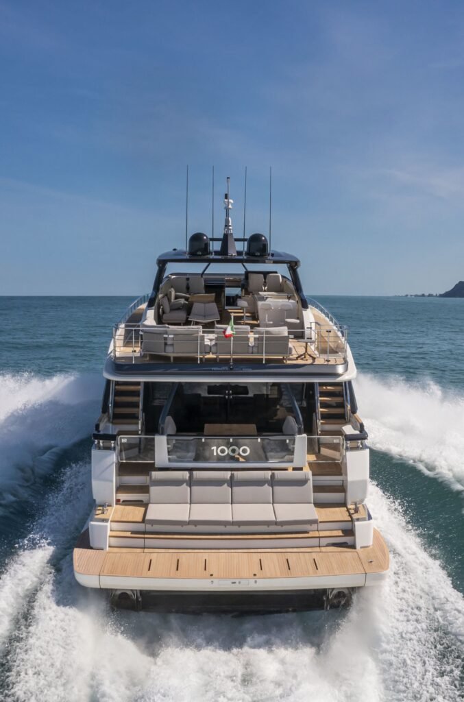O modelo impressiona pela proporção e pelo equilíbrio entre design e funcionalidade. As áreas externas são amplas e contínuas, com destaque para o flybridge generoso e espaços de convivência que privilegiam circulação fluida. No interior, o acabamento segue o padrão italiano, com materiais nobres e uma distribuição que favorece conforto em longas estadias.