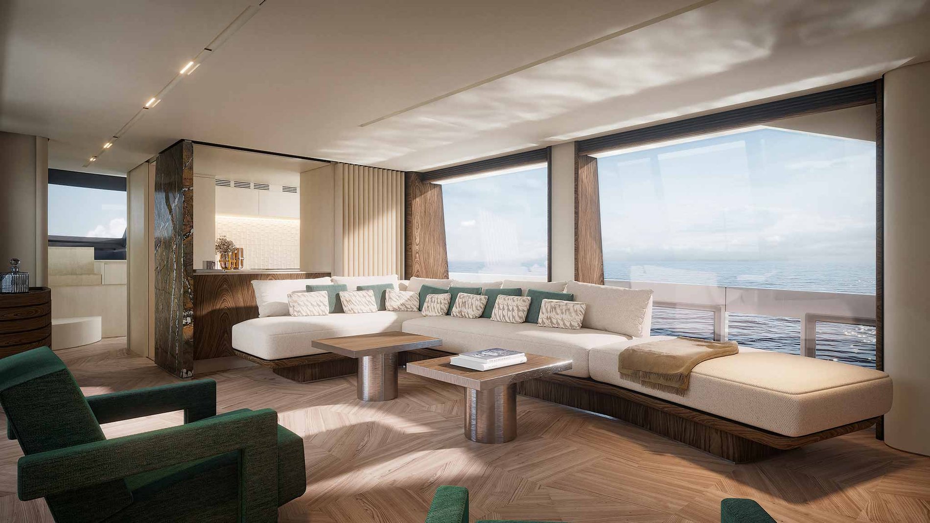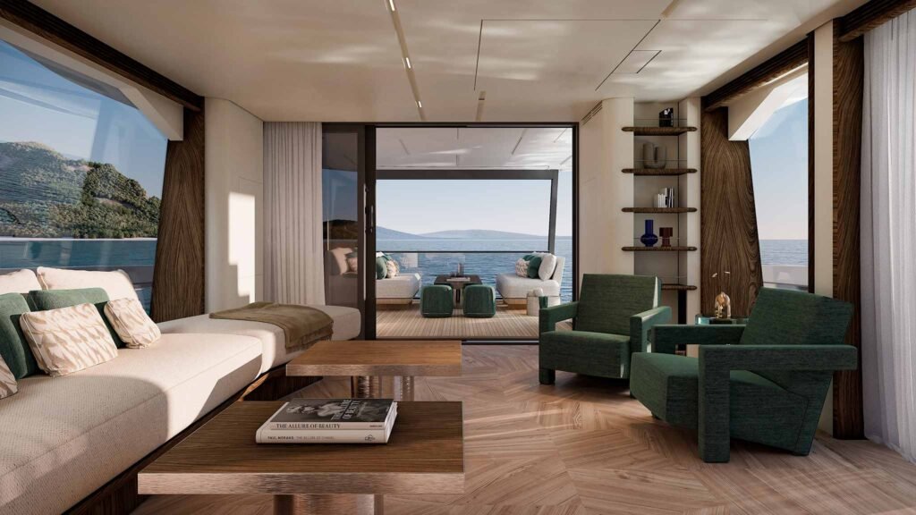 Outro elemento que chama atenção é a incorporação de pisos de vidro em varandas laterais. Mais do que um recurso estético, essa solução amplia a percepção de espaço e reforça a conexão visual com o mar, criando uma experiência mais imersiva a bordo.